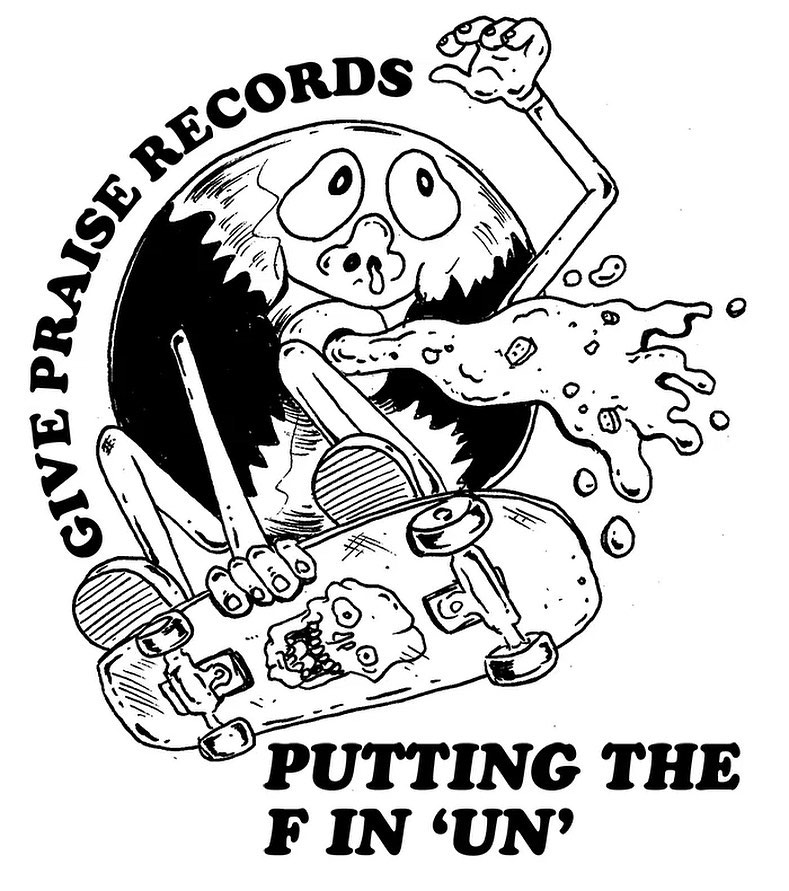 Paul Sunderland is a skateboarder and musician who has been running punk and metal label Give Praise Records since 2005. You can see from his company’s collaborations with skate musicians and it’s skateboarding graphical output that he’s devoted to skating and includes it in everything he does but specifically the street skating thrash era of the late 1980s and early 1990s.