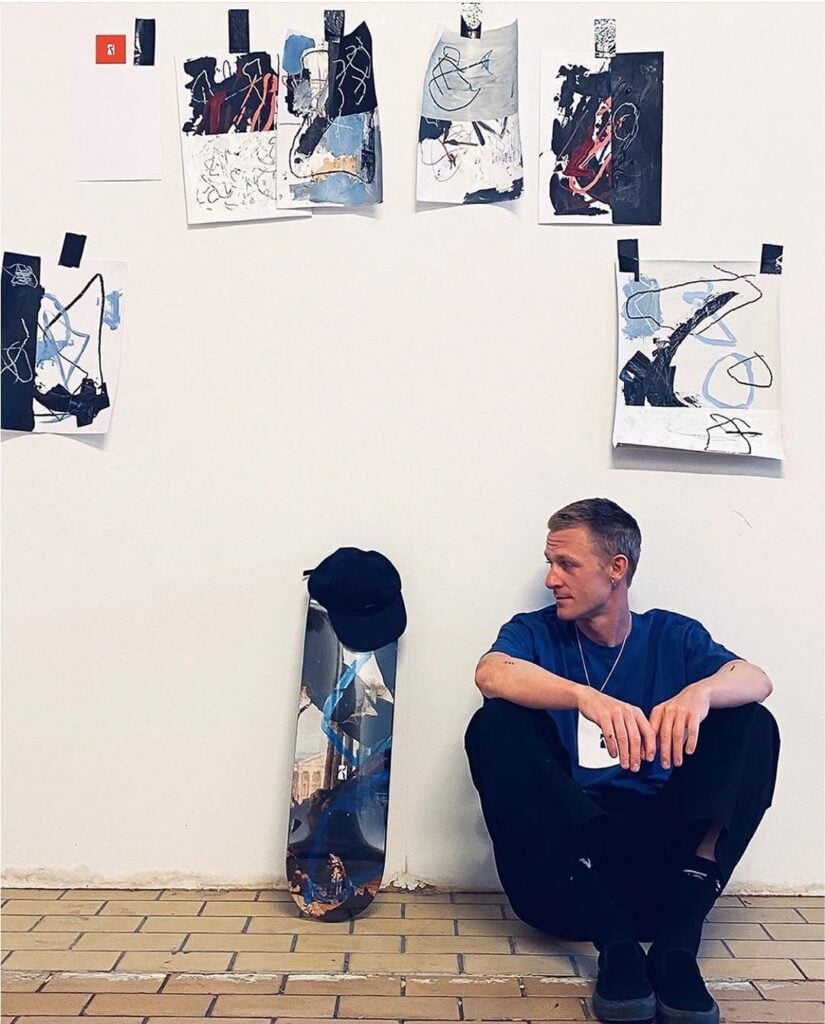 But alongside his ledge skating skills, his eye for connecting stylish shapes, wood and concrete extends from plazas and bench spots into his paintings, sculptures and art for his brand.